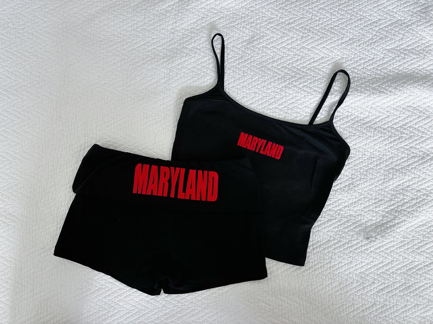 Matching roll over mini shorts and tank top black set with school name on the back of the shorts. Customizable for ANY school